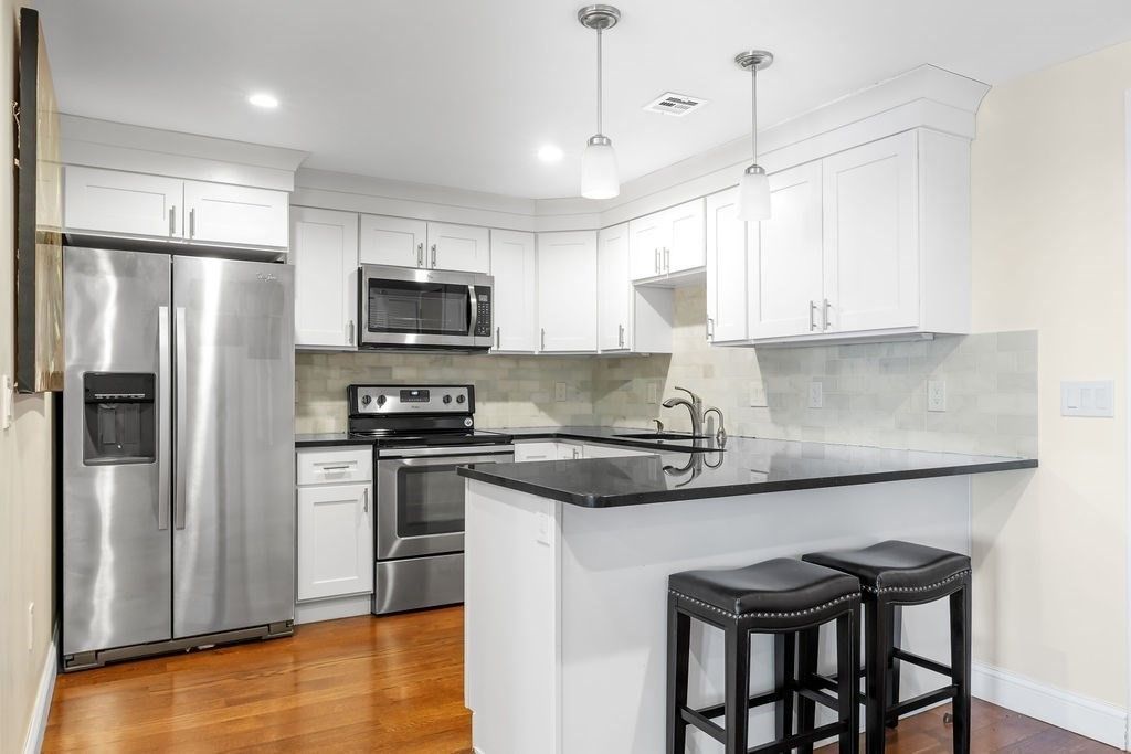 Welcome to Waterbridge! Located in the heart of Watertown Square, this spacious one bedroom, one bathroom condo offers a special opportunity to live comfortably in close proximity to city amenities, parks and open space. This fourth floor unit was beautifully renovated in 2017 with a thoughtfully designed kitchen including granite countertops, stainless steel appliances and sleek soft-close shaker-style cabinetry. From the entry, the kitchen flows seamlessly to dining and living spaces which enjoy bright indirect sunlight from large windows. An adjoining office with a large closet and French doors offers many possible uses. Off the living...read more